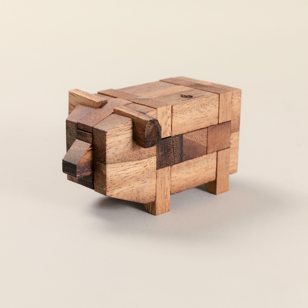 Today, Kumiki puzzles are classified by Jerry Slocum as figural, interlocking solid puzzles, a sub-classification under the greater umbrella of mechanical puzzles. In its classification, interlocking solid describes the puzzles construction and the methods for solving it. Puzzles that fall into this category require both assembly and disassembly in order to solve. Kumiki puzzles are figural in that the shape they compose when assembled tends to mimic existing objects or animals rather than geometric creations. Kumiki puzzles can come in a nearly endless number of shapes; including – but by no means limited to – a dog, pig, airplane, boat, wine barrel, and more. Kumiki puzzles like these that compose interesting objects or animals are very popular for adults and kids alike. Largely on account of how useful they are even after being solved. With a puzzle like Best Friend, or Lindbergh’s Spirit, knowing the final shape helps the puzzler in finding the solution. When one or more parts are easily identifiable from the get-go, it is easy to know which parts will be able to join together, and therefore the puzzle becomes easier as well. What these specific kinds of Kumiki puzzles may lack in difficulty, they more than make up for with their replay ability. The fun continues even after completing the puzzle multiple times. Since they make such fascinating shapes and objects, they make perfect decorations for a desk, coffee table, or bookshelf. While on display as home décor they can then be admired, enjoyed, and solved by any guests or passersby. Or, for children, they can be used as play toys when fully constructed.