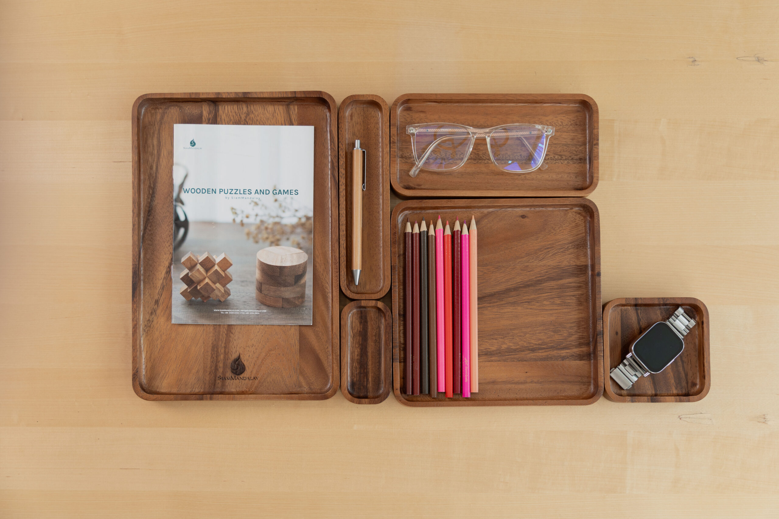Transform your home or workspace with this 6-Piece Premium Acacia Wood Organizer Tray Set, designed to combine functionality, elegance, and durability. Each tray is handcrafted and hand-finished to showcase the natural beauty of acacia wood, making it a timeless addition to any room.