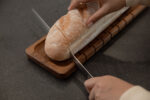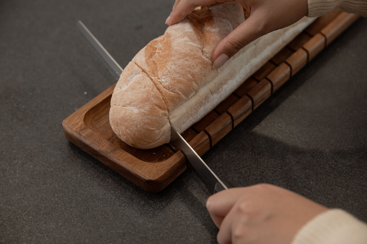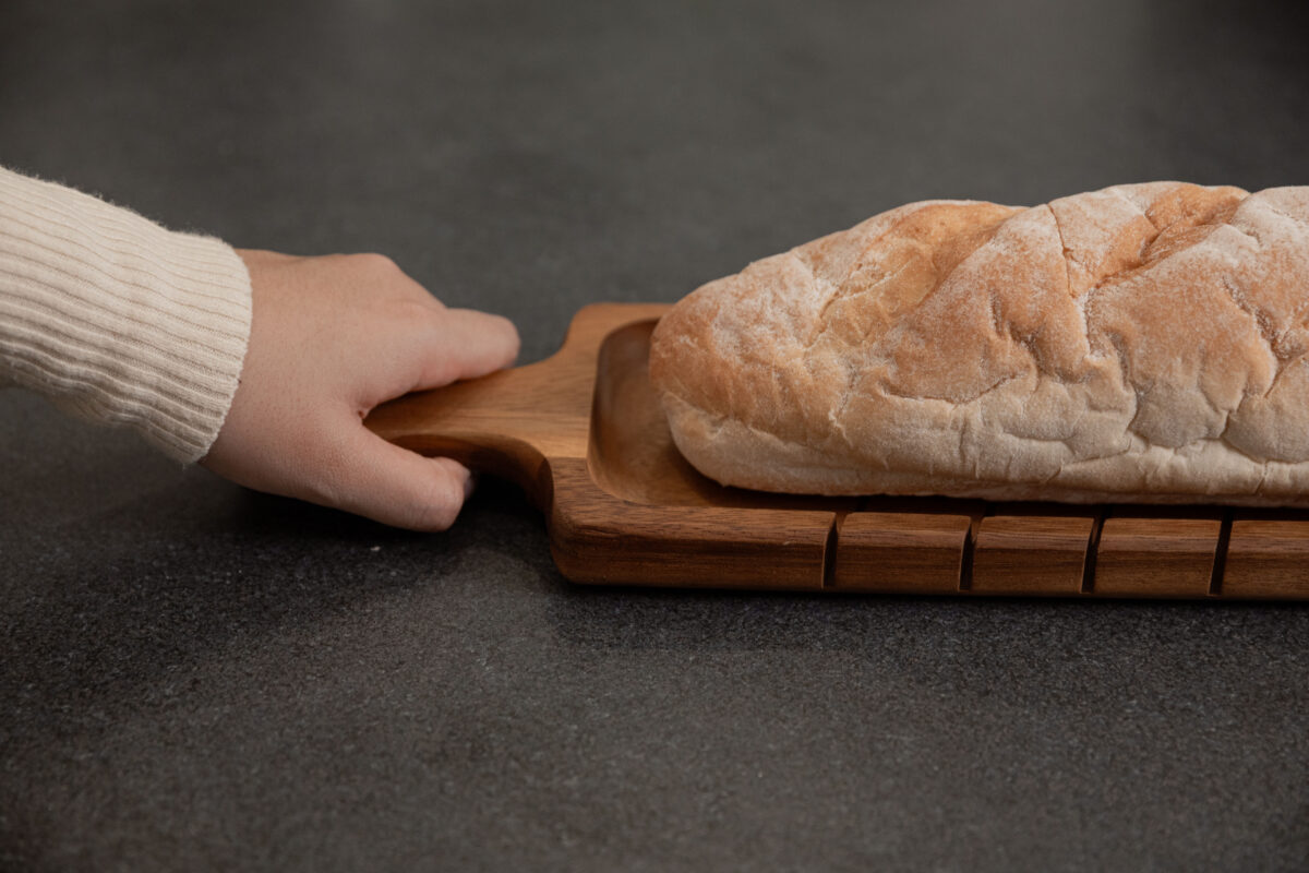 This baguette slotted cutting board is ideal for slicing your bread evenly for any occasion. The slots are designed to make cutting consistent portions a breeze. An added handle makes this board exceptional for serving guests too.