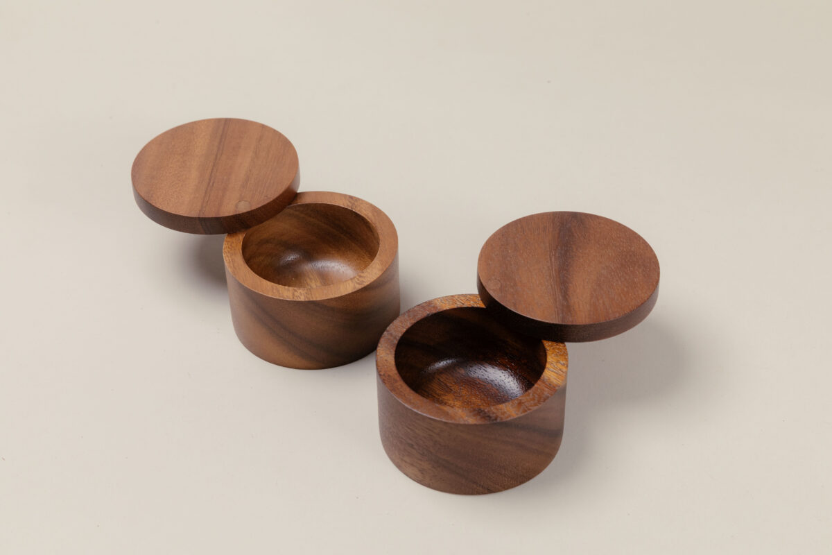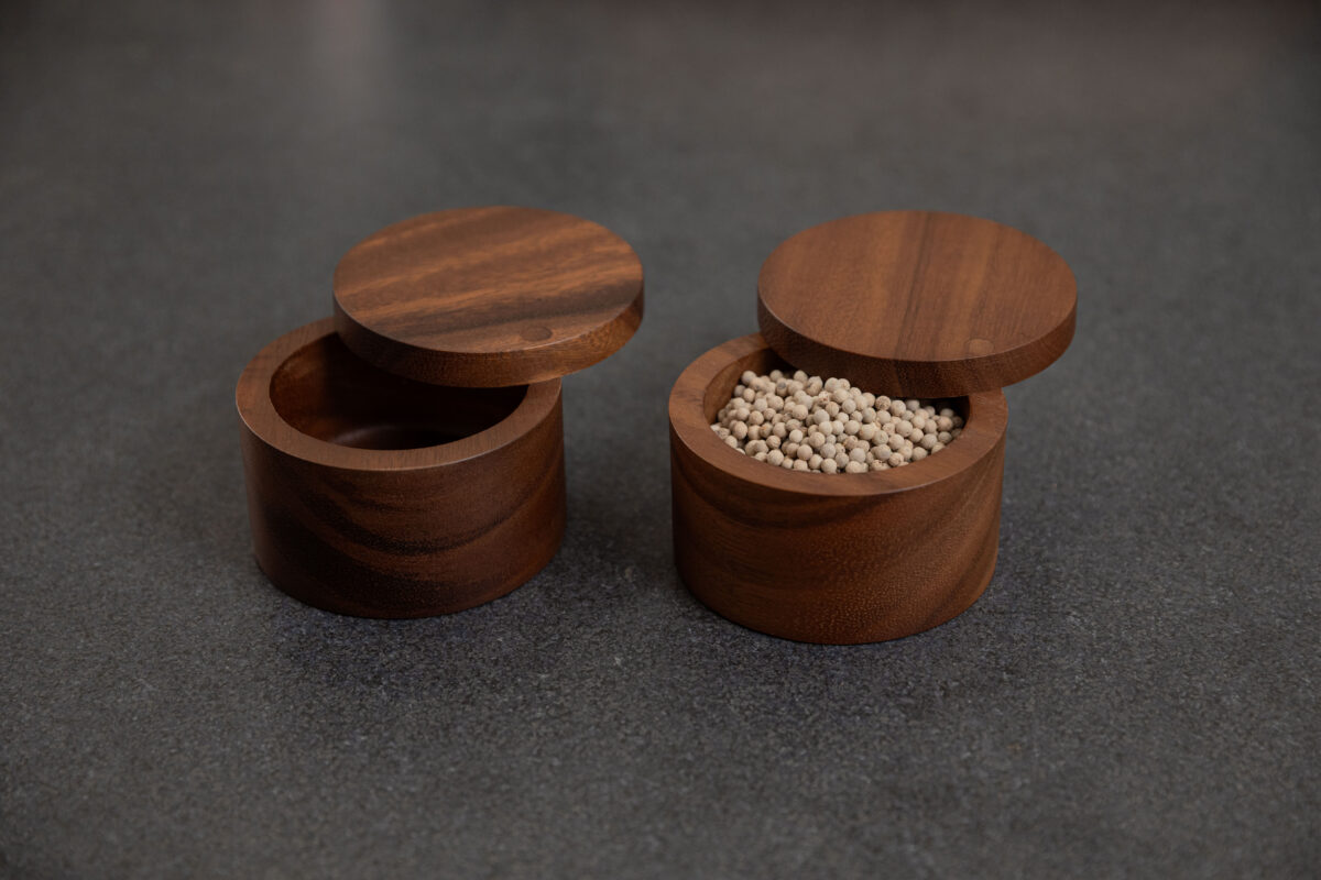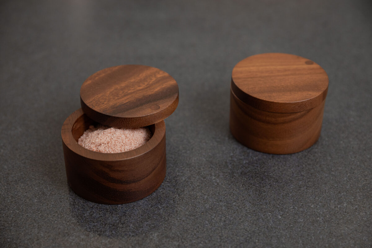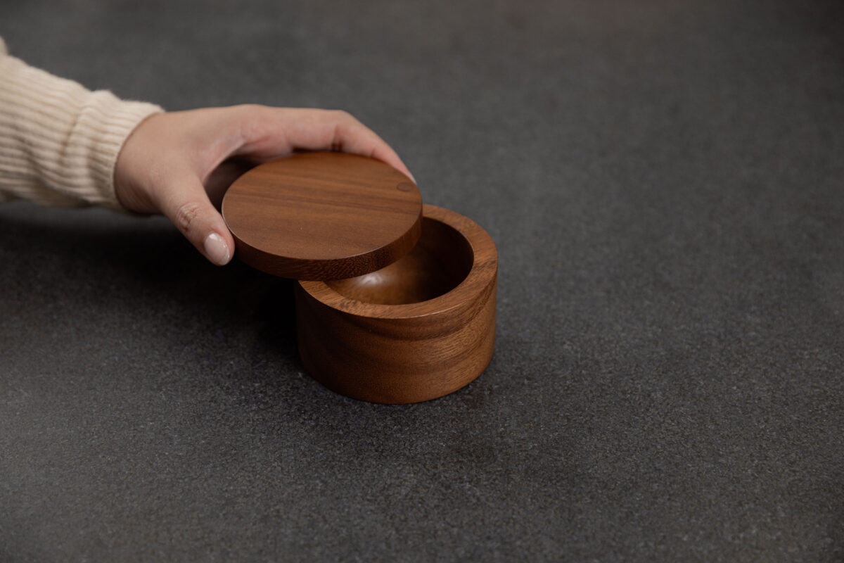 SiamMandalay’s Artisanal Salt Box from the Gourmet Collection; handcrafted for more beautiful and functional kitchen storage. This acacia wood container has a 360° swivel top which provides easy access to any seasoning or spice you may keep inside. Excellent for keeping your cooking salt fresh and separate from your serving salt.