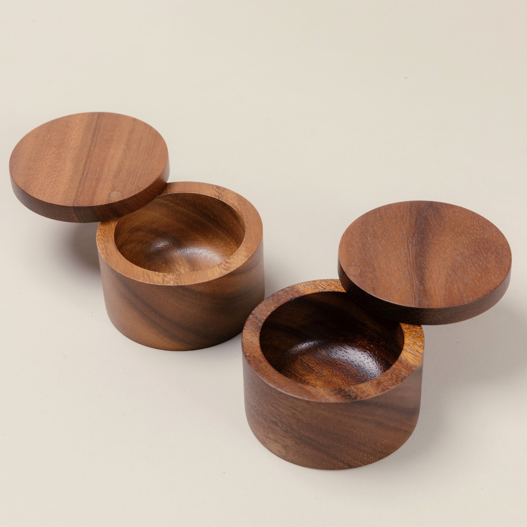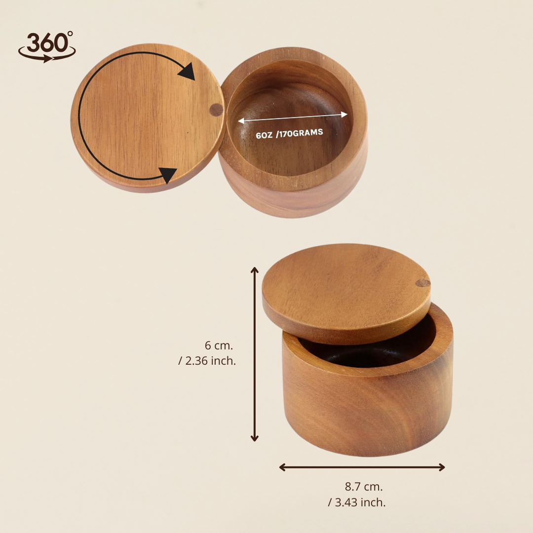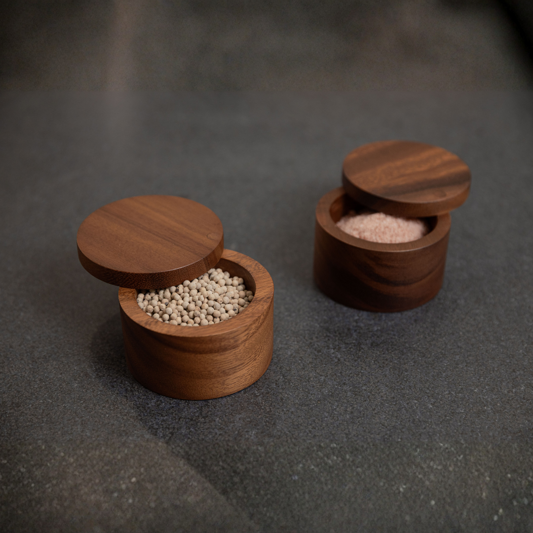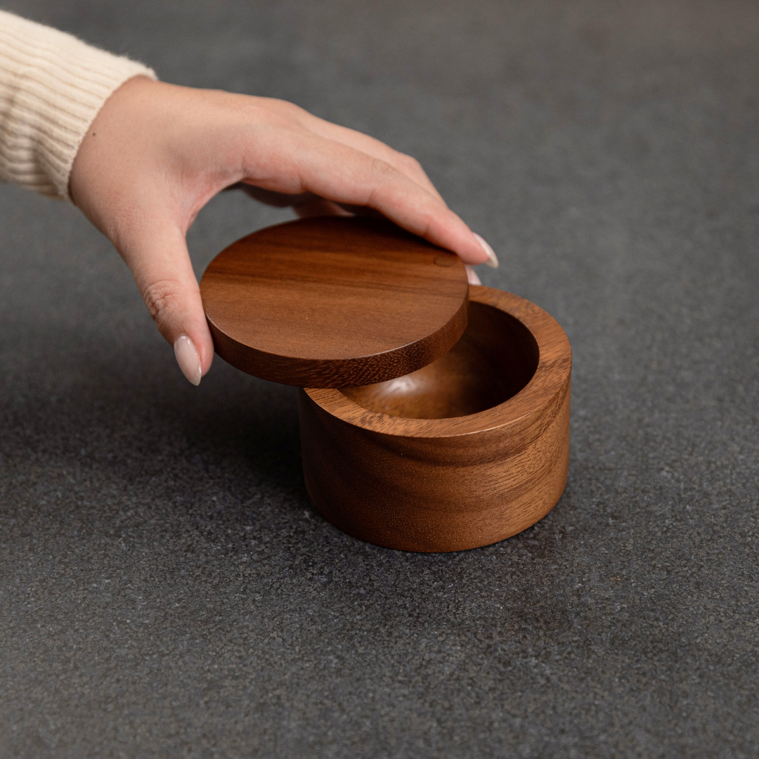 SiamMandalay’s Artisanal Salt Box from the Gourmet Collection; handcrafted for more beautiful and functional kitchen storage. This acacia wood container has a 360° swivel top which provides easy access to any seasoning or spice you may keep inside. Excellent for keeping your cooking salt fresh and separate from your serving salt.