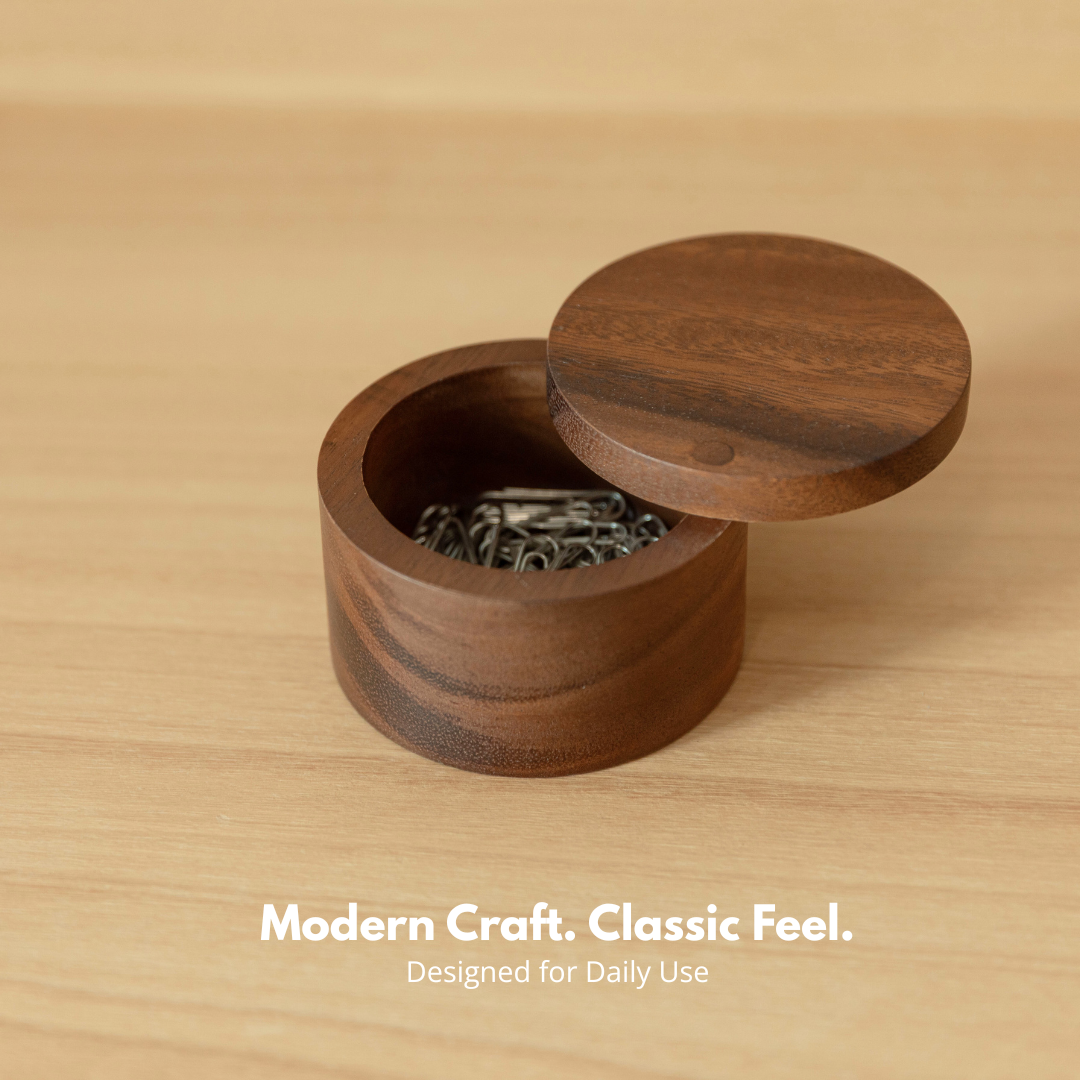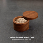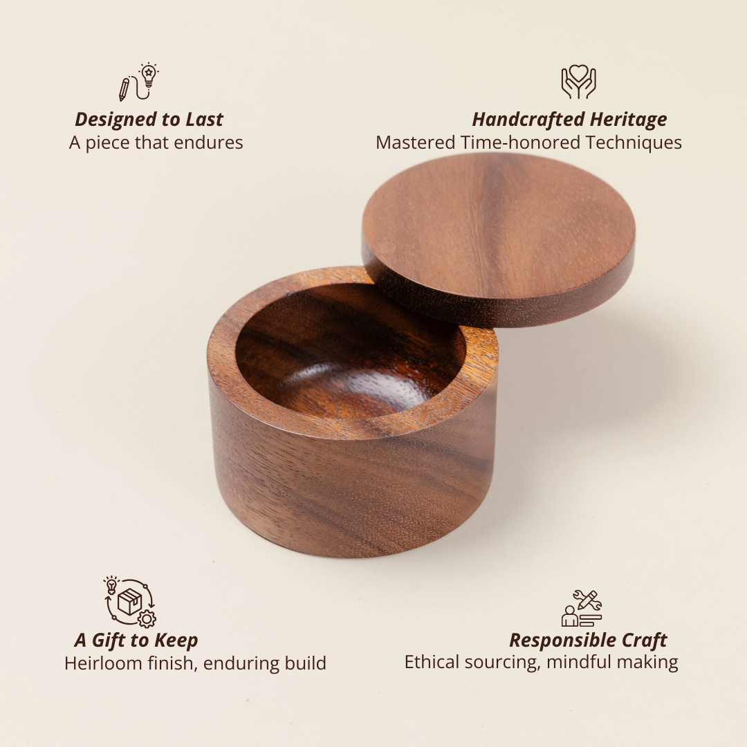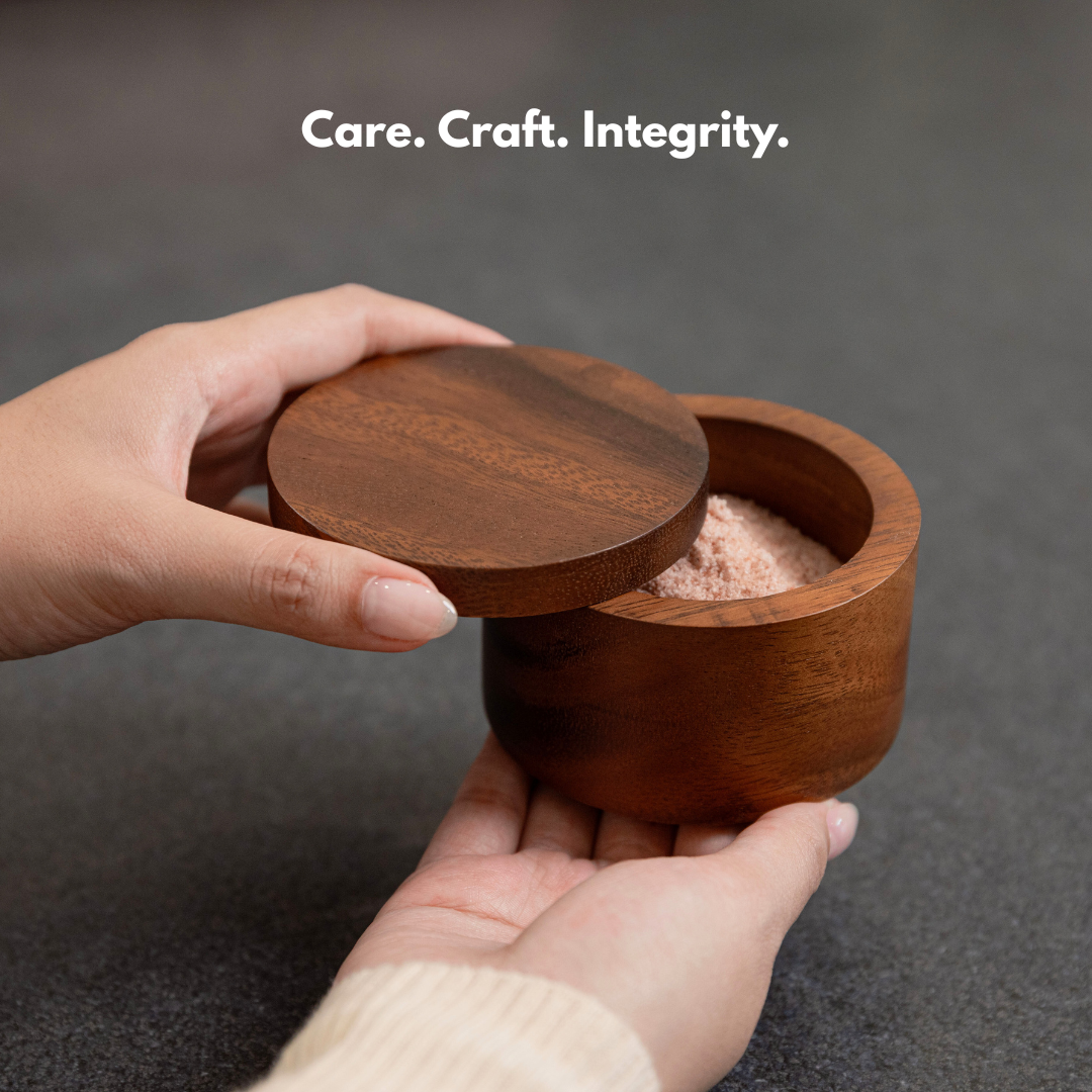 SiamMandalay’s Artisanal Salt Box from the Gourmet Collection; handcrafted for more beautiful and functional kitchen storage. This acacia wood container has a 360° swivel top which provides easy access to any seasoning or spice you may keep inside. Excellent for keeping your cooking salt fresh and separate from your serving salt.