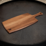 An elongated pure acacia wood charcuterie board. The Perfect Serving Platter for your favorite selections of meats, cheeses, crackers, and hors d’oeuvres with a convenient handle for carrying and presenting.