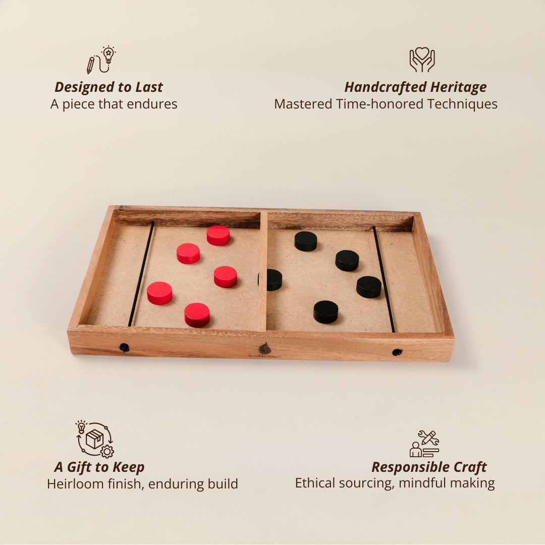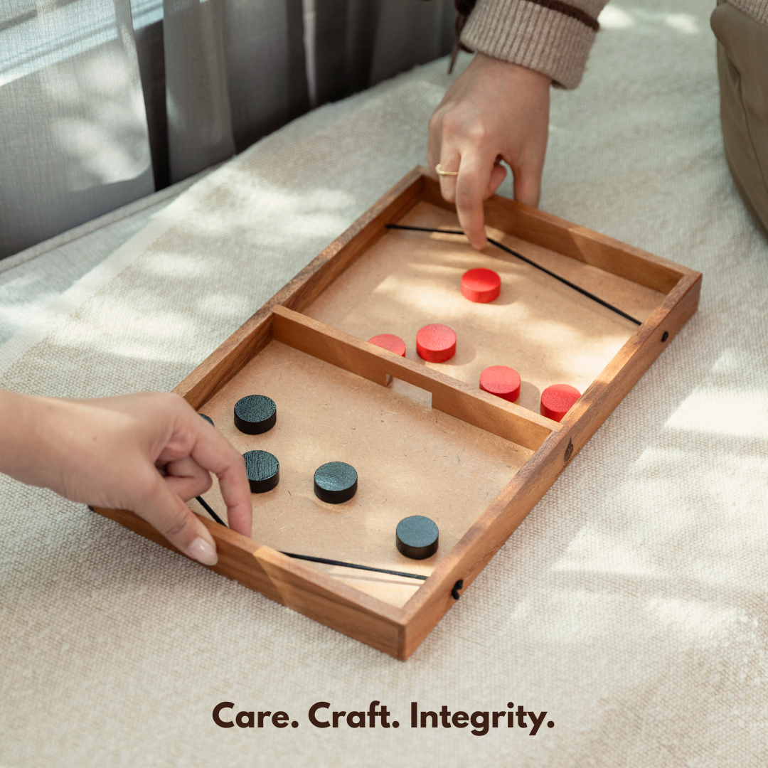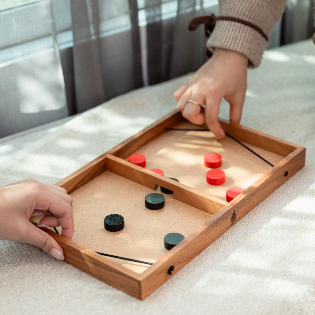 Experience high-energy competition with the Fast Sling Puck Game by SiamMandalay. Expertly handcrafted from sustainably sourced wood, this tabletop game combines traditional craftsmanship with fast-paced action. Perfect for 2 players, the game challenges you to launch pucks through the center slot using the built-in elastic band, racing to clear your side before your opponent does.