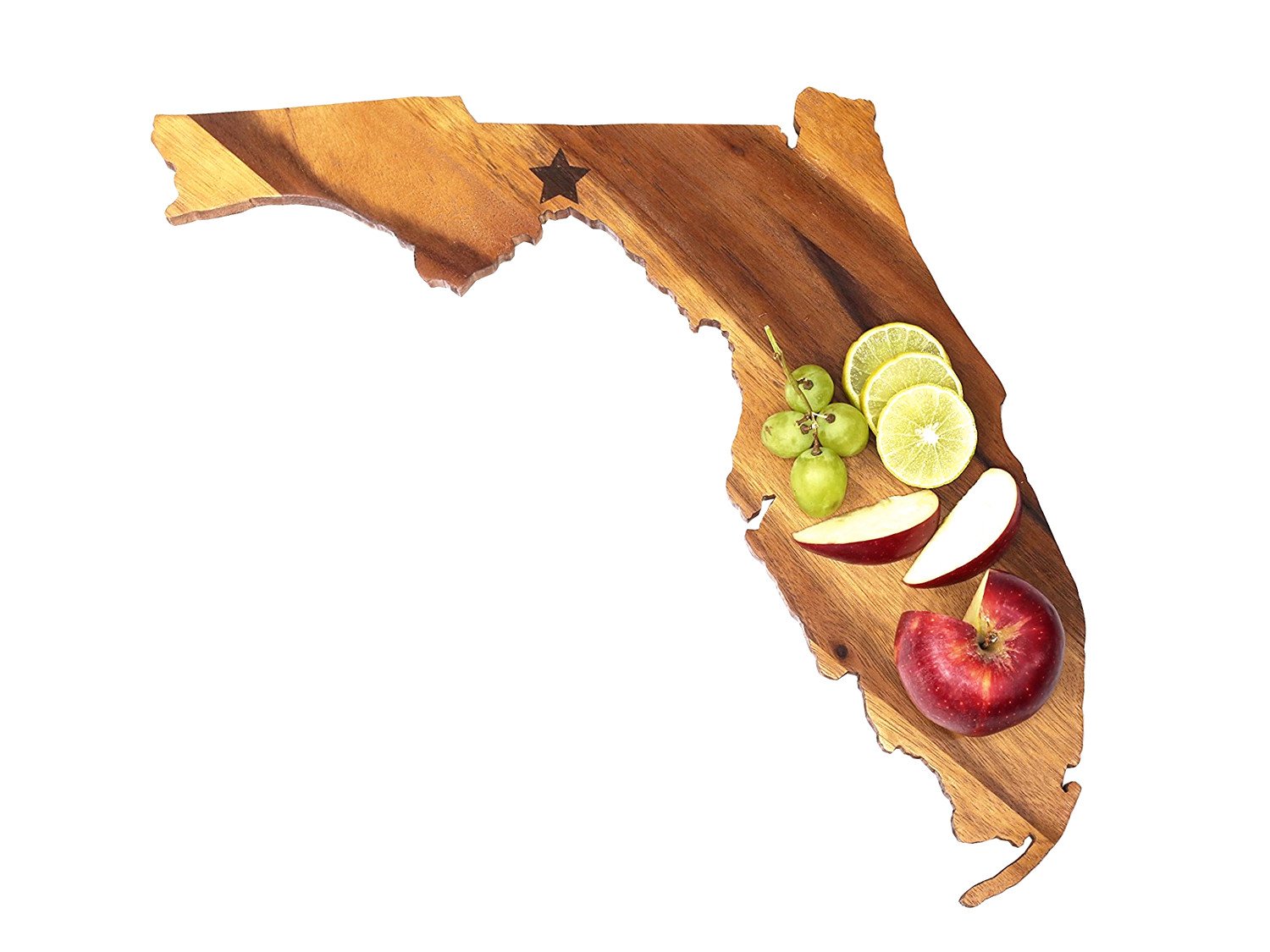 SiamMandalay’s Florida state-shaped cutting board is made from a 100% sustainably crafted Monkey-pod wood. The front side has a laser engraved star, to represent the capital on the back the date they were admitted to the the union.