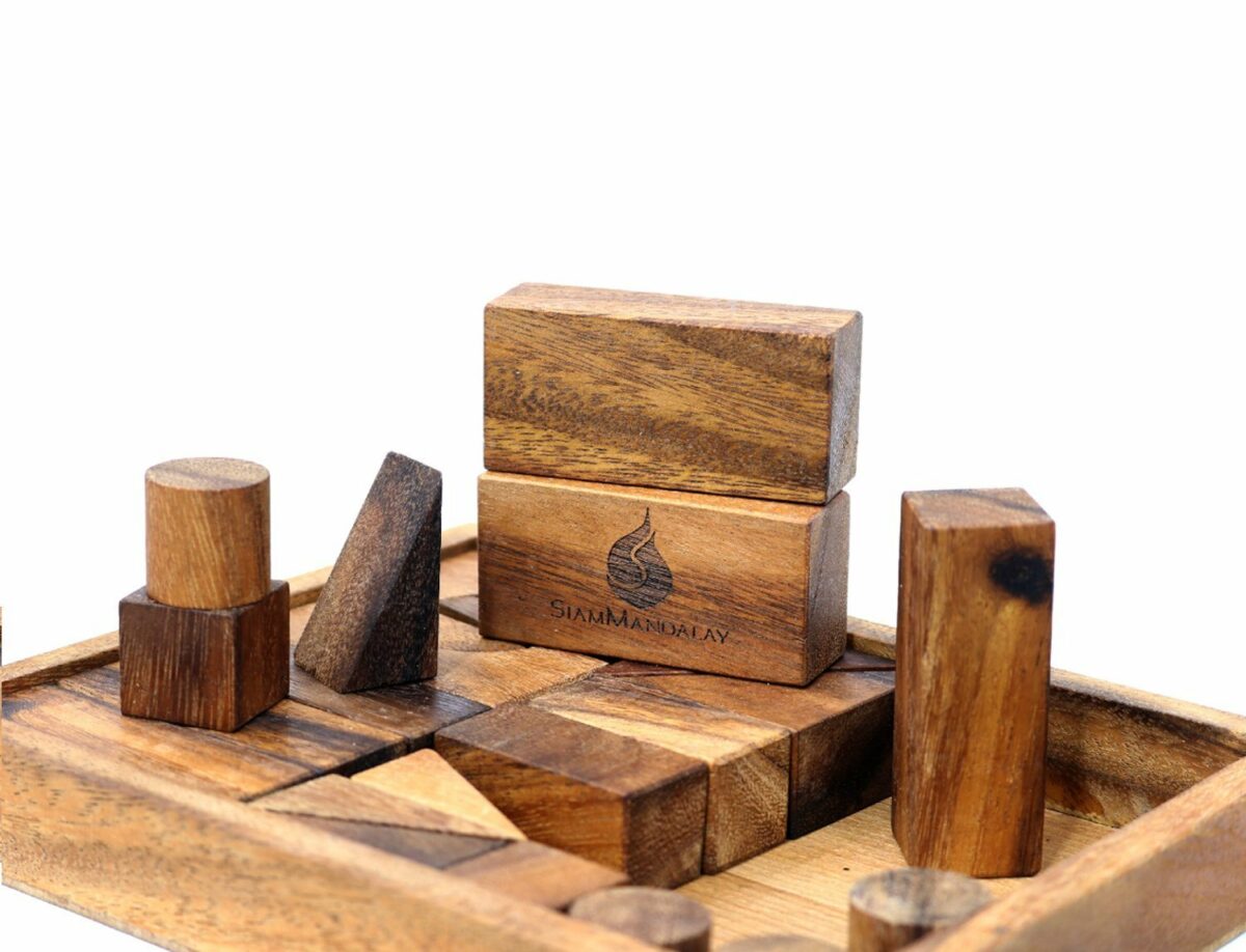Multi-piece tangram style wooden puzzle. Assemble the pieces in the box.