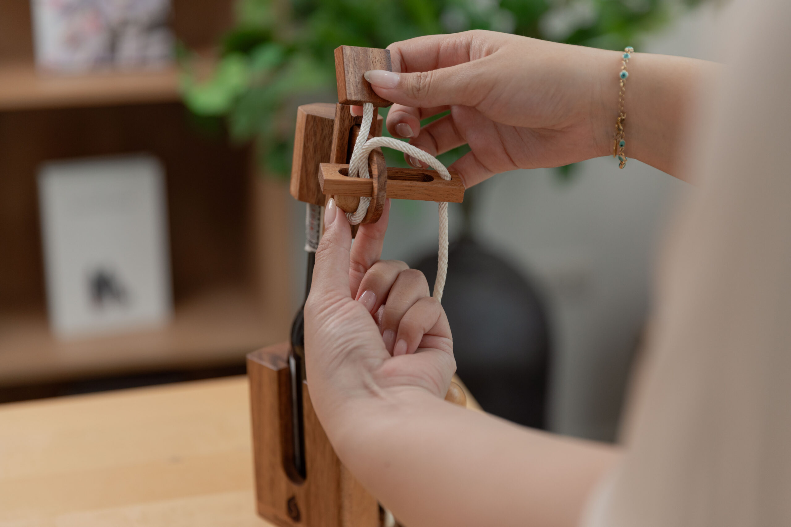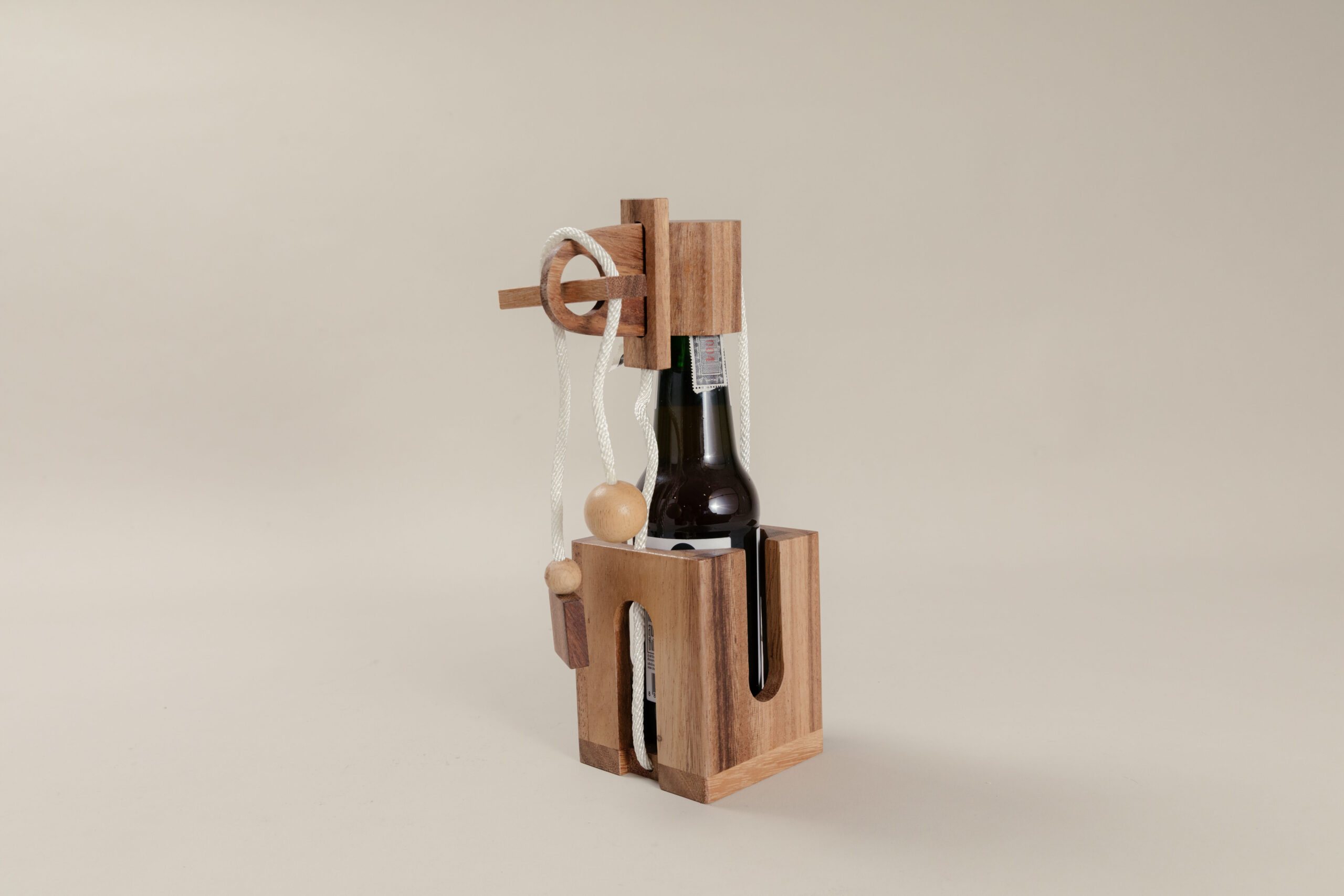 Unlock a world of challenge and craftsmanship with our Handcrafted Wooden Beer Bottle Puzzle. This clever wooden bottle lock game secures a standard beer, wine, or spirit bottle inside a beautifully designed eco-friendly wooden puzzle—the only way to release it is by solving the brain teaser!